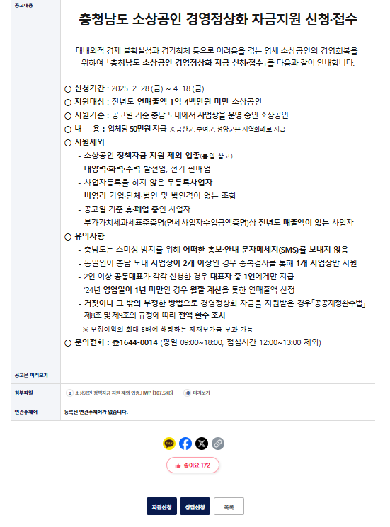 - 사업장 소재지: 공고일 기준(2025년 2월 28일) 충청남도 내에서 사업장을 운영 중인 소상공인